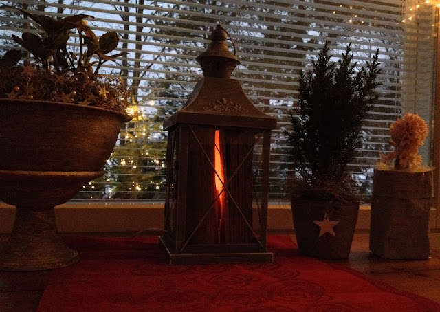 * Jos joku siellä ihmettelee tuota lyhdyn punertavaa tuiketta, niin siellä on vanhan kelon sisällä koverrettu kolo sellaiselle "loimu"lampulle. On kuin rakovalkea. Tuo kelolamppu oli ennen seinällä, mutta päätyi nyt lyhdyn sisälle.