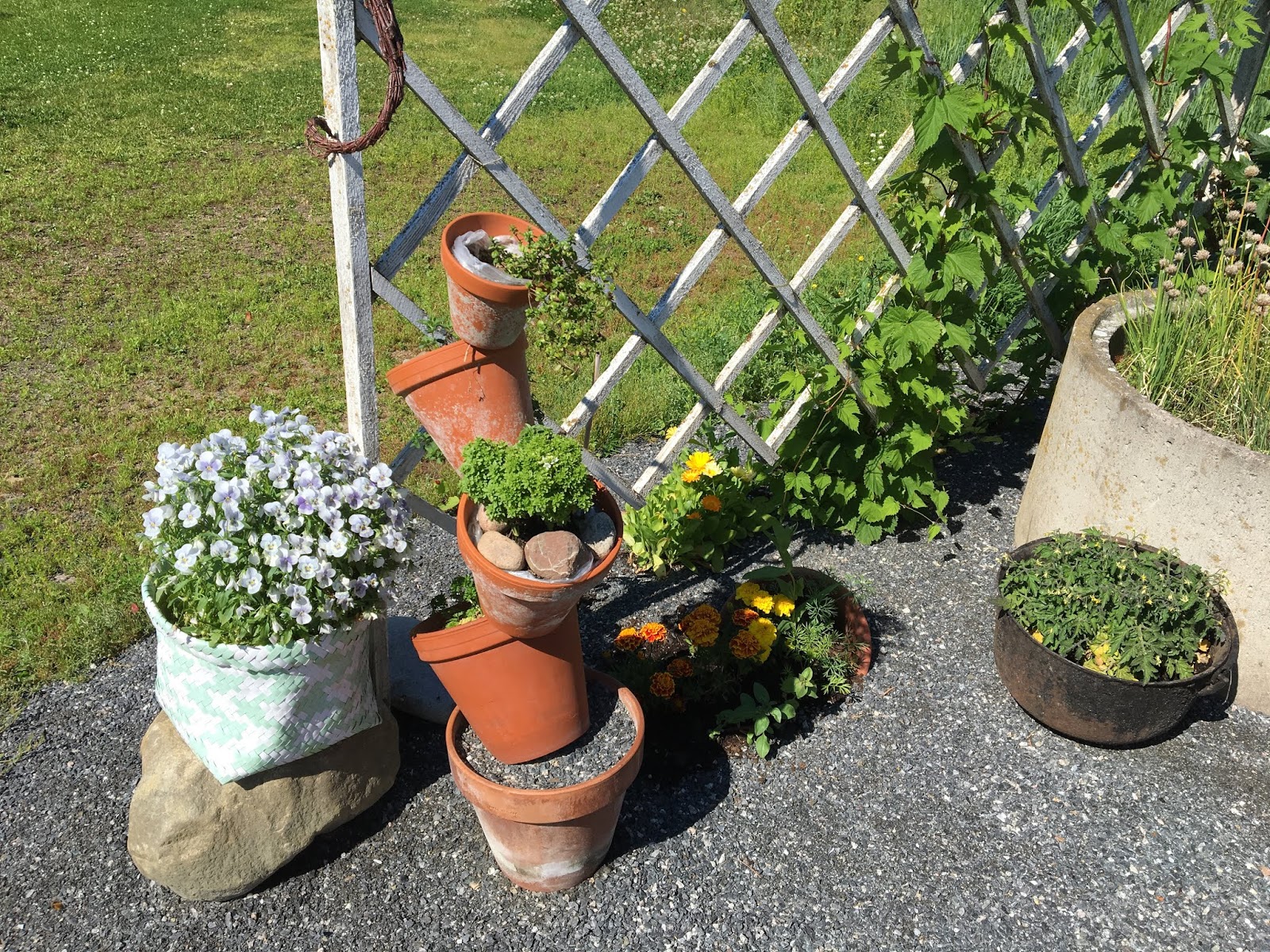 Kehäkukat kukkivat, ja muualta siirretty humala kipuaa ristikkoaitausta pitkin.